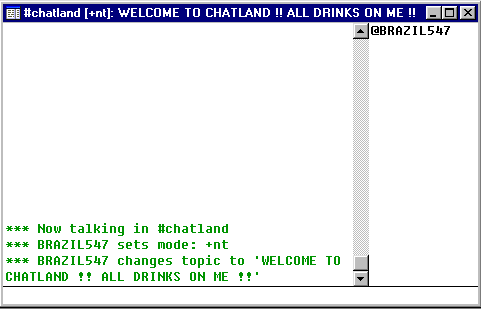 Here is a visual example of what a new channel looks like when you have just started it in mIRC under Microsoft Windows. Keep in mind, channel names cannot have spaces in them.