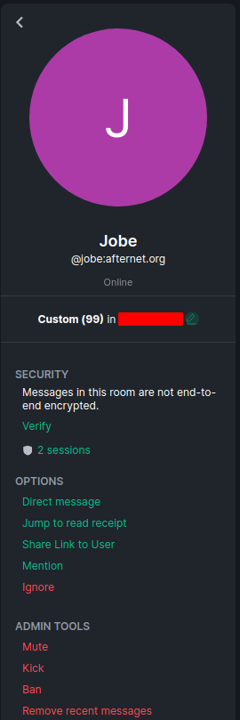 Users in Element are listed on the right-hand side for the room. Clicking on a user provides more information on that user as well as commands you can do that will affect the user, ie: kick / ban. Depending on room settings and your powerlevel you can also mute and remove recent messages from a user.