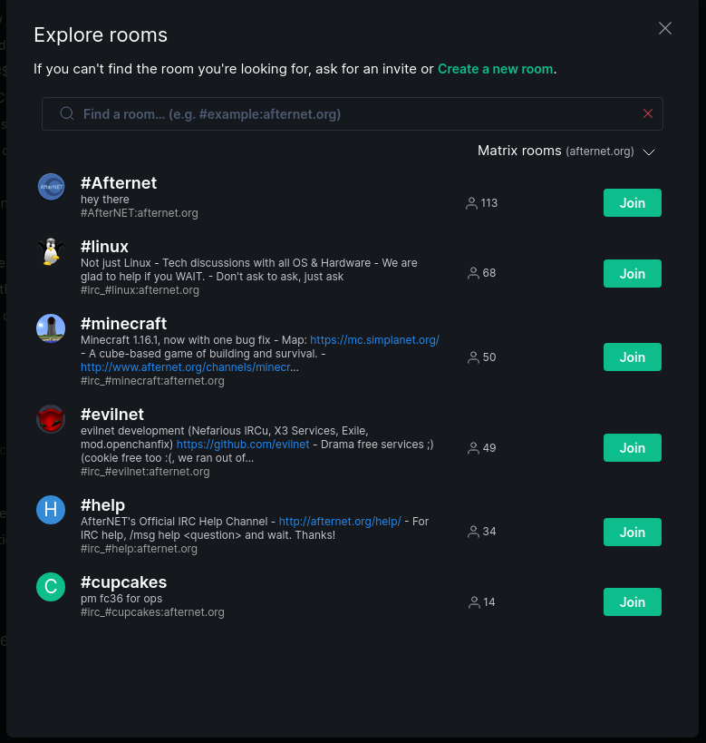 Rooms not listed in the Room Explorer can be joined by doing /join #channel:afternet.org in your Matrix client.
