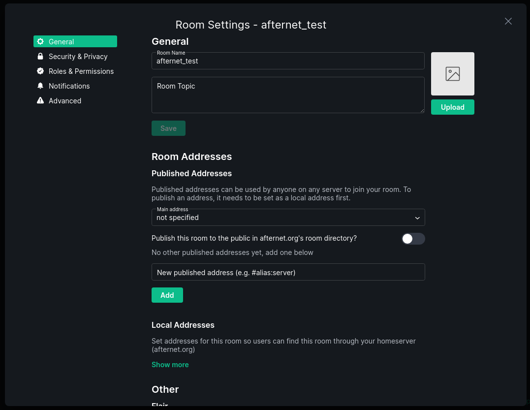This tab contains all the generic room settings such as name, topic, icon, you can also add the room alias, make the room public or private on the room explorer, flair from communities (still under heavy work), enable/disable url and image previews for yourself or as a default for new members joining the room and leave the room.
