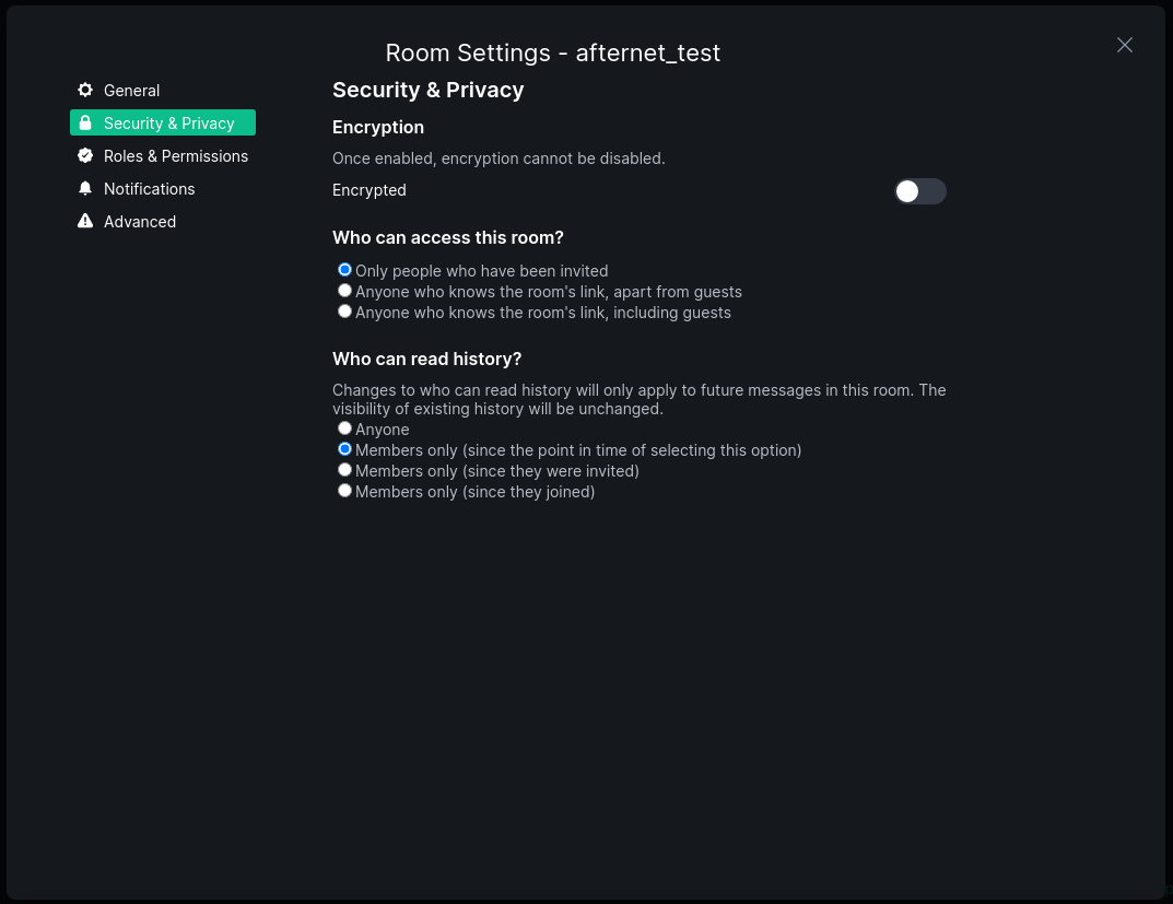The next tab, Security & Privacy, determines who can join the room, who can read the history of the room and whether or not the enable full encryption (you can only turn this on, it cannot be turned off) Do not enable encryption on rooms that are bridged to IRC as this will make the bridge in that room fail to function.