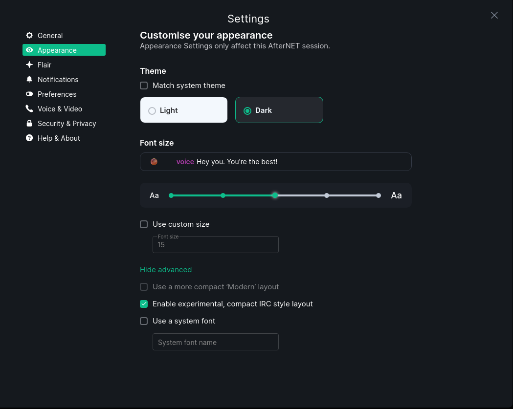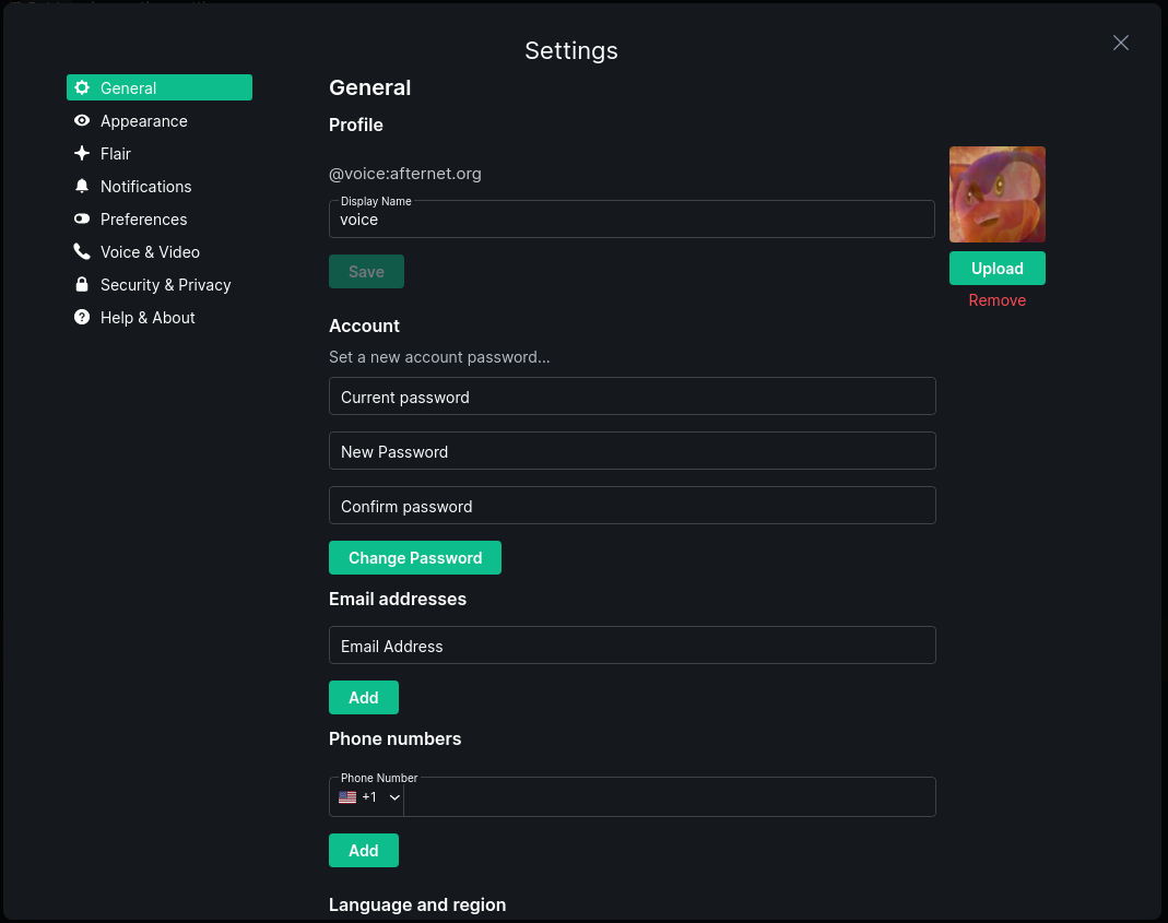 Also in this tab you can set your language and region, for advanced users specify your identity and integrations servers or you can deactivate your account. Note that deactivating your account will render it no longer usable on the AfterNET homeserver.